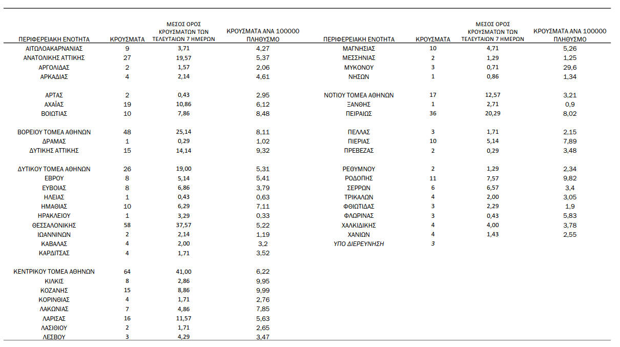 Ο ημερήσιος αριθμός και κρούσματα ανά 100.000 πληθυσμού επιβεβαιωμένων εγχώριων κρουσμάτων COVID-19 ανά περιφερειακή ενότητα στις 21 Ιανουαρίου 2021: