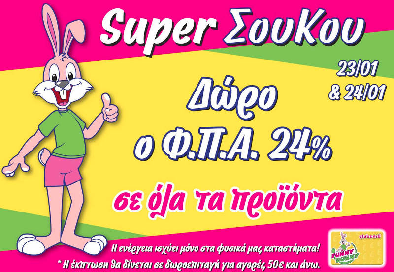 Μόνο αυτό το Σάββατο και Κυριακή 23 & 24 Ιανουαρίου, κάντε έξυπνα τις αγορές σας στα Funny Bunny και κερδίστε το ΦΠΑ 24%.