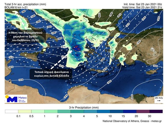 Το πρώτο κύμα κακοκαιρίας, θα επηρεάσει από τις μεσημεριανές ώρες του Σαββάτου 23/01 τη Δυτική Ελλάδα με τοπικά ισχυρές βροχές και καταιγίδες και χιονοπτώσεις στα ορεινά. Τα έντονα φαινόμενα προοδευτικά θα επεκταθούν σχεδόν στο σύνολο της ηπειρωτικής χώρας και το βράδυ στο Κεντρικό και Βόρειο Αιγαίο. Τοπικά θυελλώδεις άνεμοι νοτίων διευθύνσεων θα επικρατήσουν στα πελάγη. Μέχρι το μεσημέρι της Κυριακής 24/01 ο καιρός θα παρουσιάσει πρόσκαιρη βελτίωση σχεδόν σε όλη τη χώρα, με παράλληλη πρόσκαιρη εξασθένηση των ανέμων.