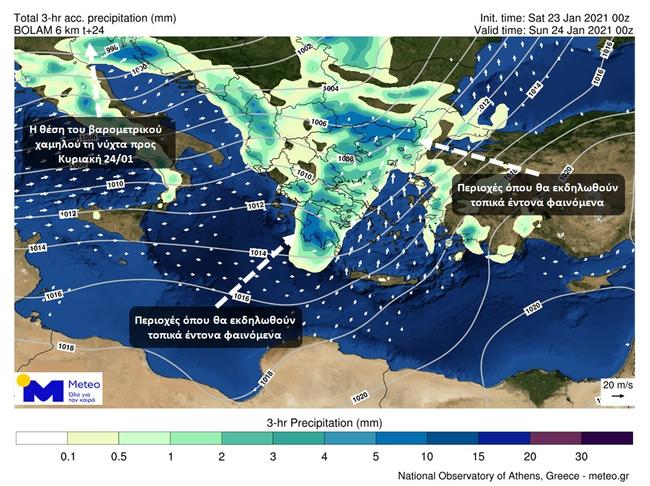 Στους προγνωστικούς χάρτες που ακολουθούν παρουσιάζονται η κατανομή των φαινομένων και οι άνεμοι που θα πνέουν, αργά το βράδυ του Σαββάτου 23/01 και τις πρώτες μεταμεσονύκτιες ώρες προς Κυριακή 24/01.