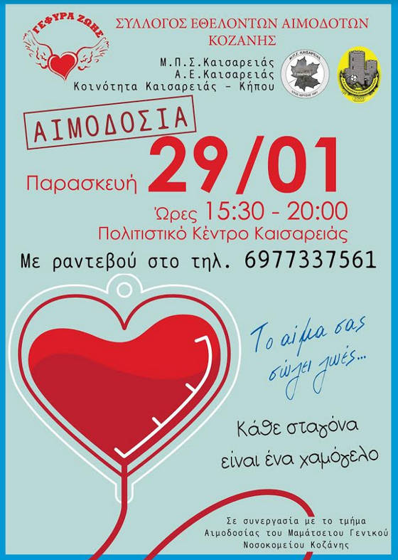 Την Παρασκευή 29 Ιανουαρίου 2021 και ΩΡΑ 15:30-20:00 στην Αίθουσα του Πνευματικού Κέντρου του Δ.Δ της Καισαρειάς διοργανώνεται Αιμοδοσία του Σ.Ε.Α. Κοζάνης, σε συνεργασία με τον Μορφωτικό- Πολιτιστικό Σύλλογο Καισαρειάς, Α.Ε. Καισαρειάς, Τοπική Κοινότητα Καισαρειάς και το τμήμα Αιμοδοσίας του Μαμάτσειου Γενικού Νοσοκομείου Κοζάνης.