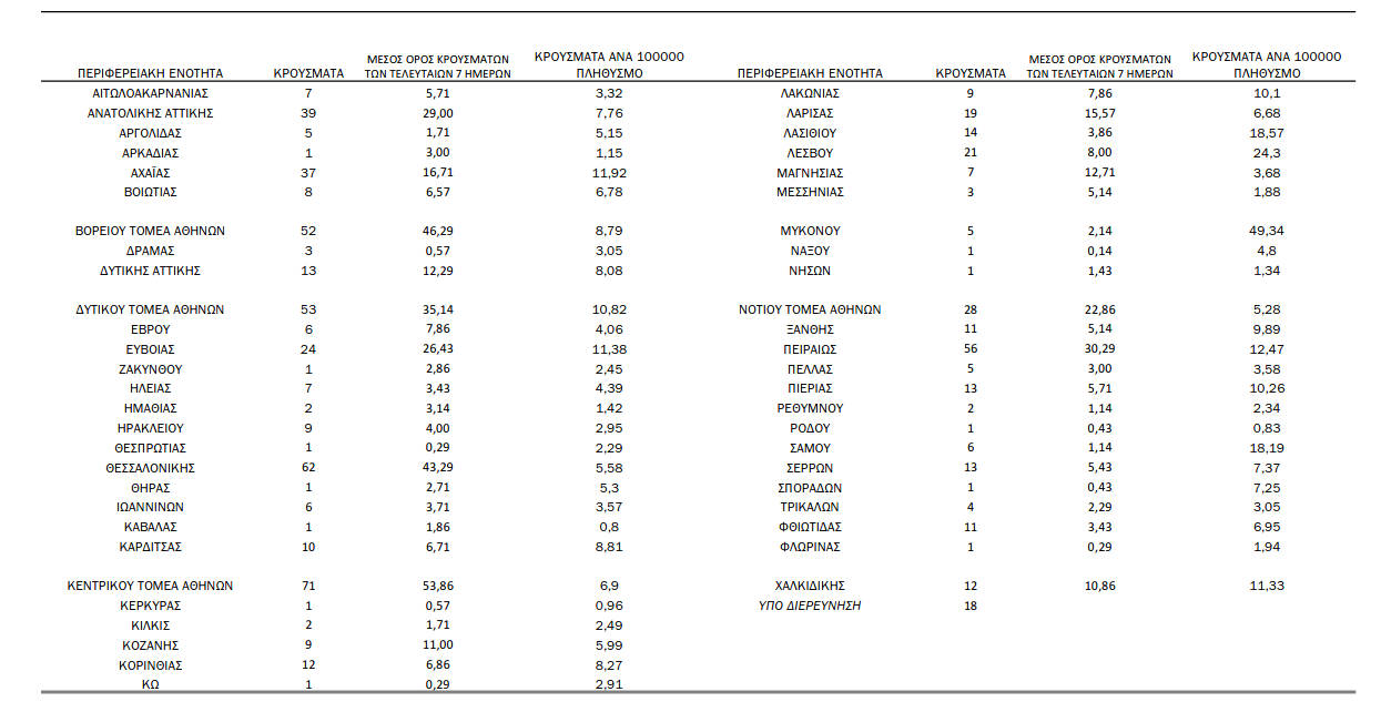 Ο ημερήσιος αριθμός και κρούσματα ανά 100.000 πληθυσμού επιβεβαιωμένων εγχώριων κρουσμάτων COVID-19 ανά περιφερειακή ενότητα στις 28 Ιανουαρίου 2021: