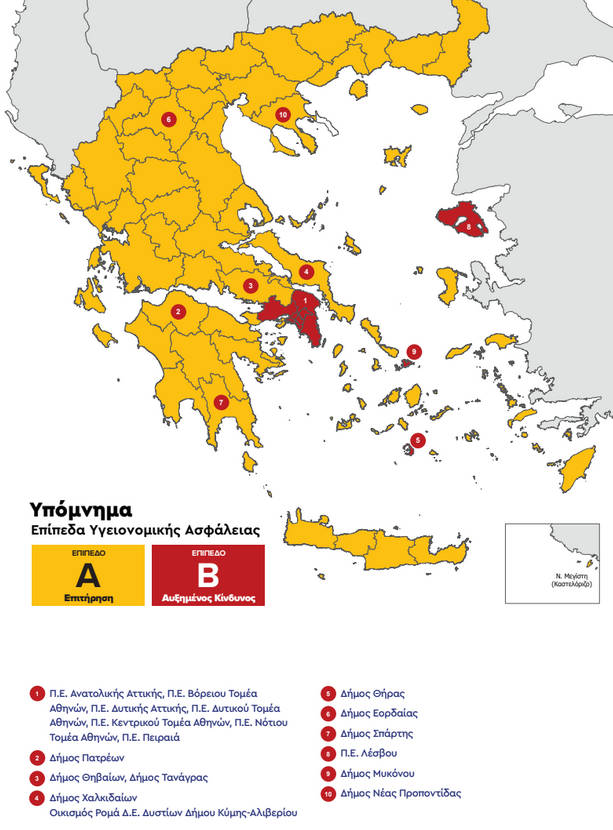 Στο «κόκκινο», επίπεδο Β, μπαίνουν από αύριο στις 6 το πρωί οι εξής περιοχές: Η Περιφερειακή Ενότητα Λέσβου, ο δήμος Εορδαίας της Περιφερειακής Ενότητας Κοζάνης, οι δήμοι Θηβαίων και Τανάγρας της Περιφερειακής Ενότητας Βοιωτίας, ο δήμος Σπάρτης της Περιφερειακής Ενότητας Λακωνίας, ο δήμος Χαλκιδέων και ο οικισμός Ρομά της δημοτικής Ενότητας Δυστίων του δήμου Κύμης-Αλιβερίου της Περιφερειακής Ενότητας Εύβοιας, ο δήμος Νέας Προποντίδας της Περιφερειακής Ενότητας Χαλκιδικής, ο δήμος Πατρέων της Περιφερειακής Ενότητας Αχαΐας ο δήμος Θήρας της Περιφερειακής Ενότητας Θήρας, η Περιφερειακή Ενότητα Μυκόνου και η περιφέρεια Αττικής πλην της Περιφερειακής Ενότητας Νήσων.