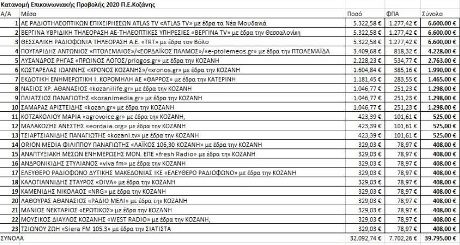 Η χρηματοδότηση των μέσων ενημέρωσης από την Π.Ε. Κοζάνης το 2020.