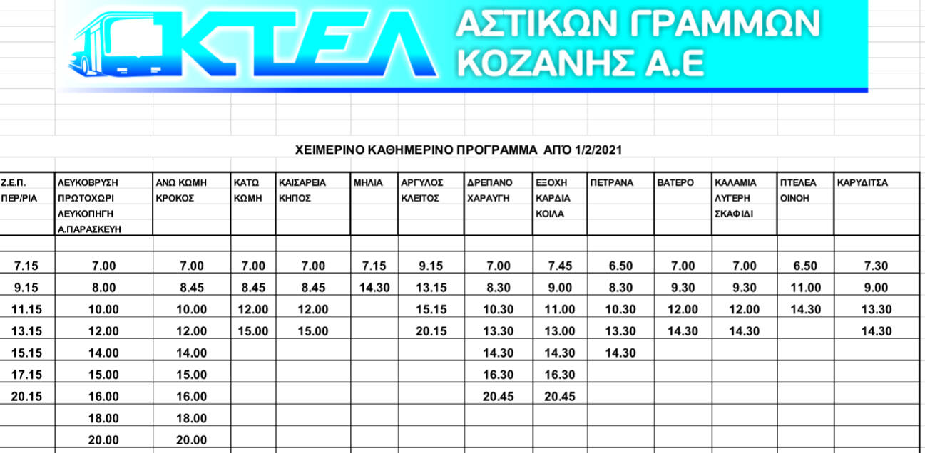 Κοζάνη 30/01/2021 Το νέο πρόγραμμα δρομολογίων της αστικής συγκοινωνία της Κοζάνης από τη Δευτέρα 1 Φεβρουαρίου 0 Το νέο πρόγραμμα δρομολογίων της αστικής συγκοινωνία της Κοζάνης το οποίο θα ισχύει από τη Δευτέρα 1 Φεβρουαρίου. Δείτε αναλυτικά τα δρομολόγια: