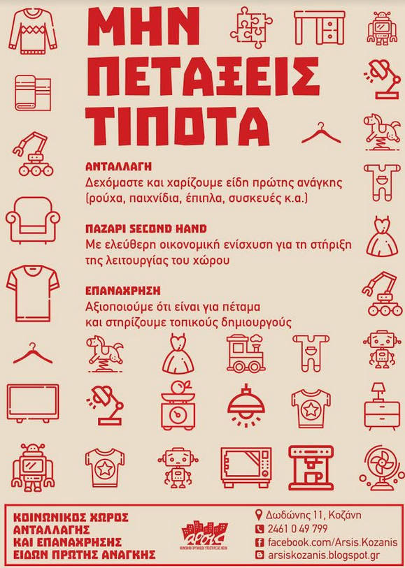 Για να λειτουργήσει η αλυσίδα παρακαλούμε όσες/ους χρειάζονται έπιπλα, συσκευές και άλλα είδη ανάγκης να μας το δηλώσουν και αντίστοιχα όσες/οι έχουν κατά καιρούς πράγματα λειτουργικά και σε καλή κατάσταση που θα ήθελαν να τα χαρίσουν να μας ενημερώσουν όσο – το δυνατόν- νωρίτερα. Με τον τρόπο αυτό δημιουργούμε μια λίστα αναγκών (με διακριτικότητα και σεβασμό), αλλά και τρέχουσας προσφοράς.