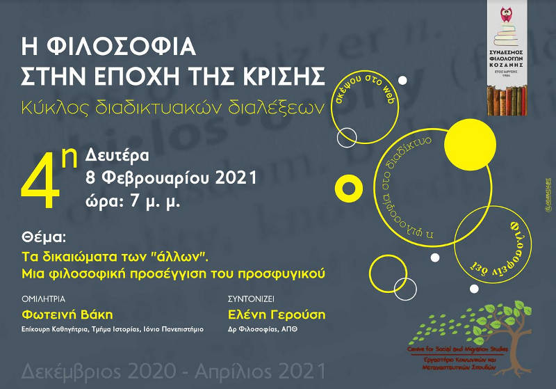 Ο Σύνδεσμος Φιλολόγων Κοζάνης και το Εργαστήριο Κοινωνικών και Μεταναστευτικών Σπουδών του Πανεπιστημίου Δυτικής Μακεδονίας σάς προσκαλούν να παρακολουθήσετε την τέταρτη διάλεξη του κύκλου διαδικτυακών διαλέξεων τη Δευτέρα 8 Φεβρουαρίου 2021, στις 7 μ. μ. με θέμα Τα δικαιώματα των ‘άλλων’. Μια φιλοσοφική προσέγγιση του προσφυγικού