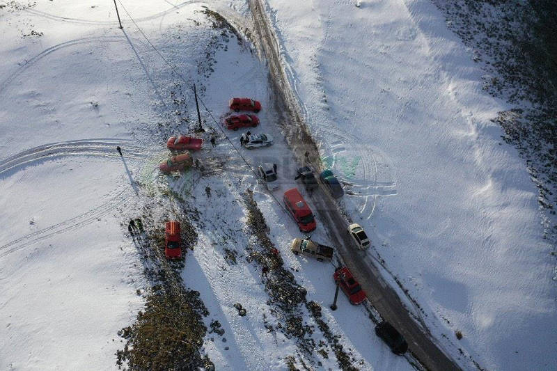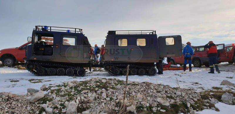 δύο (2) Πυροσβέστες με ειδικό ερπυστριοφόρο όχημα για έρευνα στα χιονοσκεπή σημεία της περιοχής.