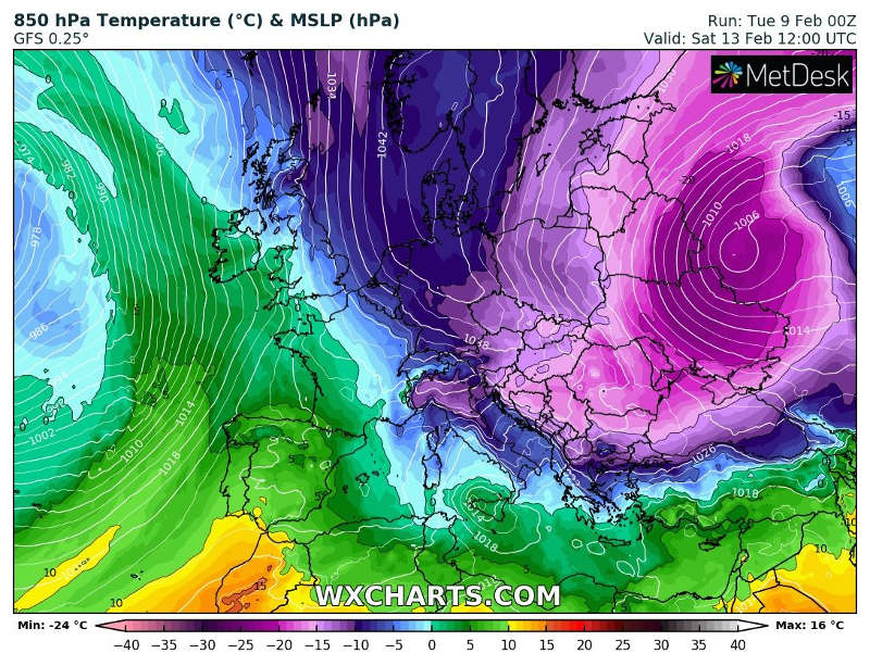 Στους τρεις ακόλουθους χάρτες μπορείτε να δείτε με χρονοσειρά από την Κυριακή (14/02) έως και την Τετάρτη (17/02) τον σχηματισμό του αντικυκλωνικού πεδίου (γνωστό ως Ωμέγα μπλοκ) στη δυτική Ευρώπη , το οποίο επεκτείνεται έως και δυτικά της Σκανδιναβίας , εξαναγκάζοντας το μπλοκάρισμα της έντονης ατλαντικής ροής των βαρομετρικών χαμηλών από τη μία πλευρά και παράλληλα την κάθοδο των πολύ ψυχρών – αερίων μαζών στη βορειοανατολική Ευρώπη – Ρωσία προς τα Βαλκάνια.