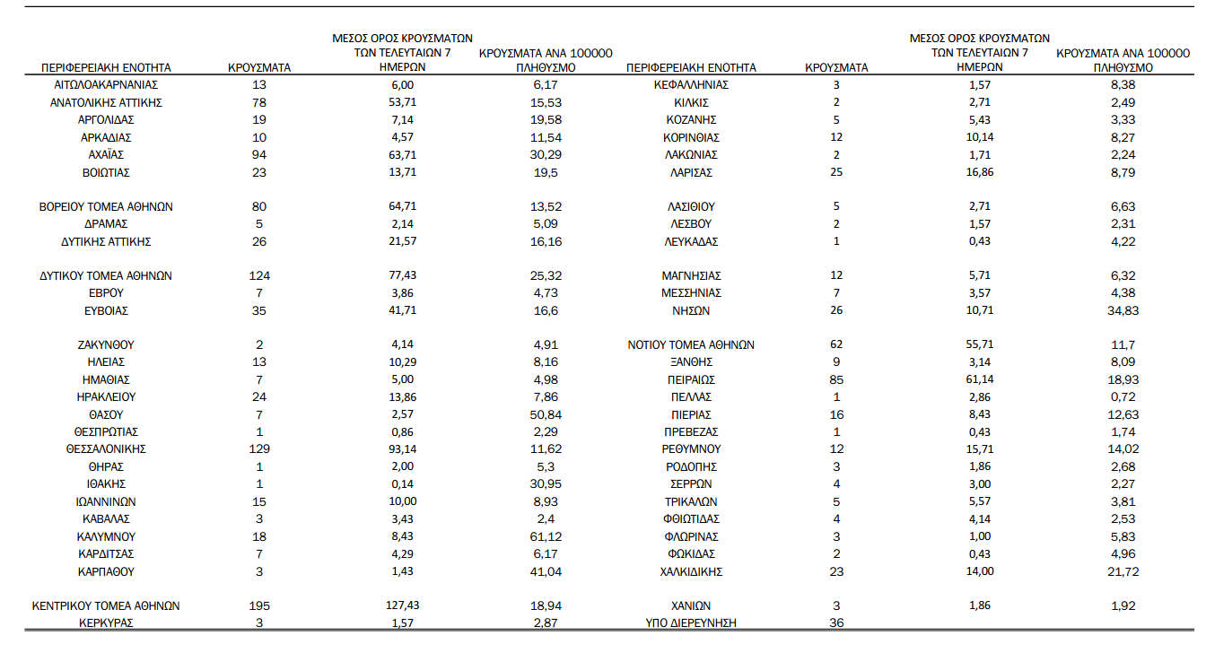 Σήμερα ανακοινώνουμε 1327 νέα κρούσματα της λοίμωξης του νέου κορωνοϊού (COVID-19), εκ των οποίων 8 εντοπίστηκαν κατόπιν ελέγχων στις πύλες εισόδου της χώρας. Ο συνολικός αριθμός των κρουσμάτων ανέρχεται στα 168872, εκ των οποίων 51.9% άνδρες. Κατά την ιχνηλάτιση βρέθηκε ότι 6088 (3.6%) θεωρούνται σχετιζόμενα με ταξίδι από το εξωτερικό και 54146 (61.1%) είναι σχετιζόμενα με ήδη γνωστό κρούσμα.