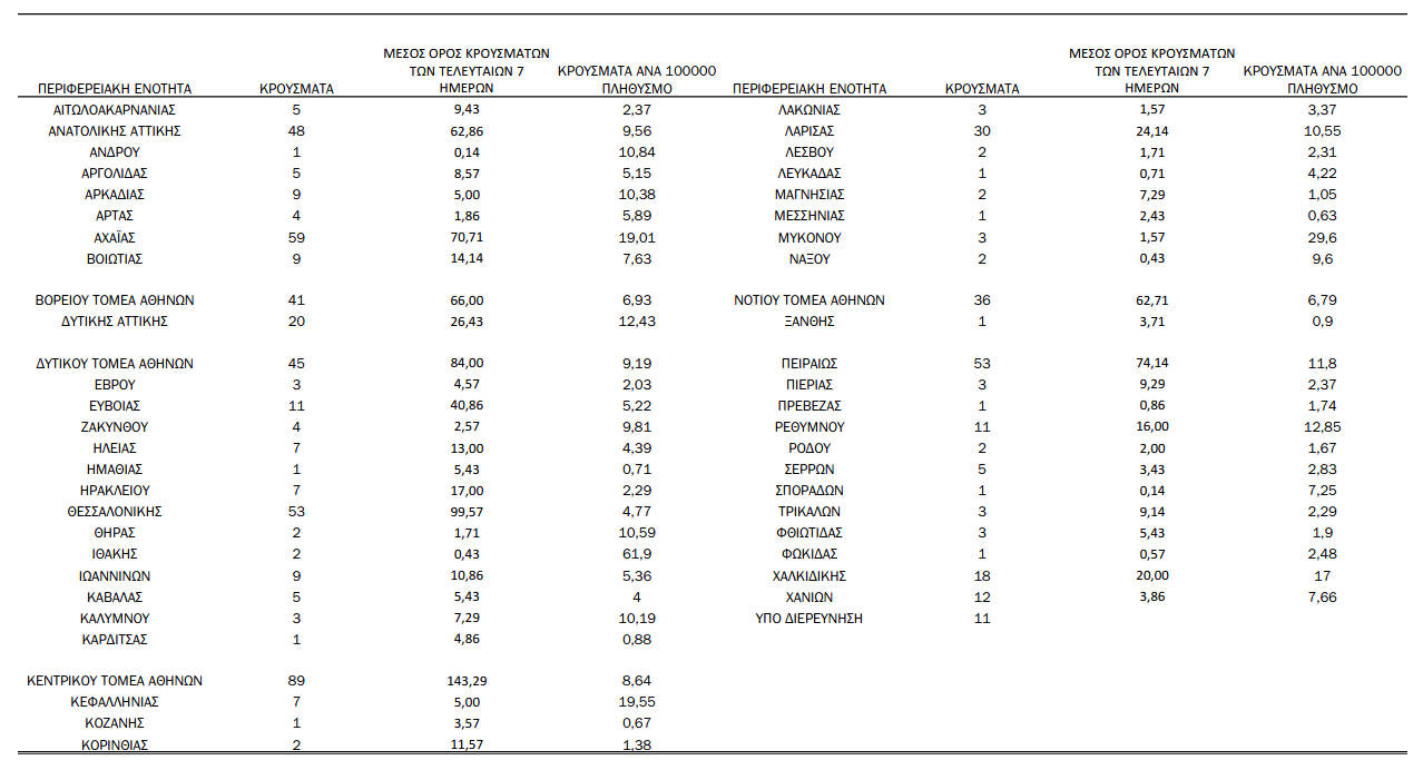 Τα νέα εργαστηριακά επιβεβαιωμένα κρούσματα της νόσου που καταγράφηκαν τις τελευταίες 24 ώρες είναι 662, εκ των οποίων 2 εντοπίστηκαν κατόπιν ελέγχων στις πύλες εισόδου της χώρας. Ο συνολικός αριθμός των κρουσμάτων ανέρχεται σε 172128 (ημερήσια μεταβολή +0.4%), εκ των οποίων 51.9% άνδρες. Με βάση τα επιβεβαιωμένα κρούσματα των τελευταίων 7 ημερών, 58 θεωρούνται σχετιζόμενα με ταξίδι από το εξωτερικό και 2696 είναι σχετιζόμενα με ήδη γνωστό κρούσμα. Ημερήσια εξέλιξη της πανδημίας: Η ημερήσια κατανομή των επιβεβαιωμένων κρουσμάτων είναι η ακόλουθη (η γραμμή παριστάνει την συνολική, αθροιστική κατανομή των κρουσμάτων).