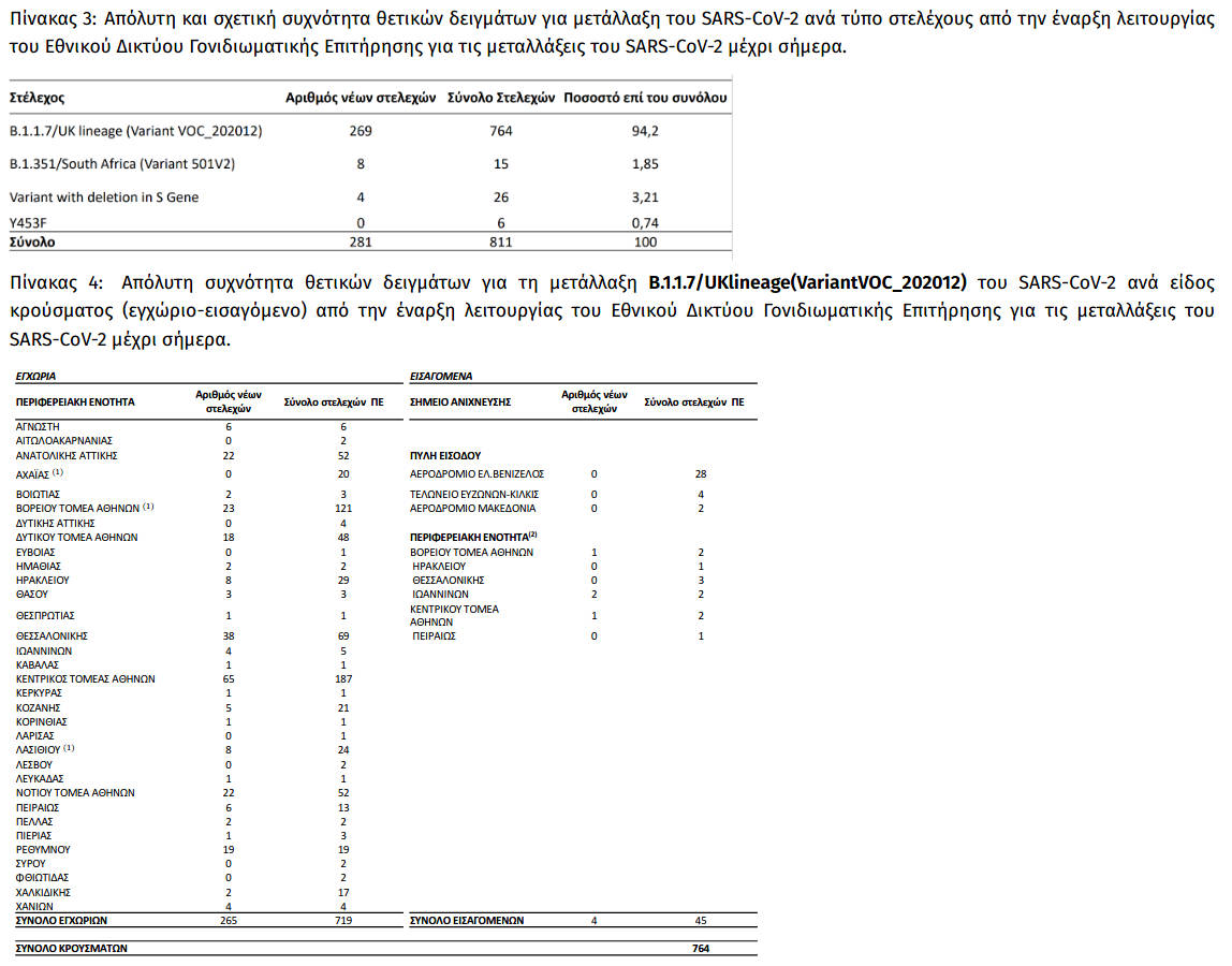 Από τα 281 στελέχη τα 269 βρέθηκαν με τη μετάλλαξη Β.1.1.7/UK lineage (VariantVOC_202012) ενώ 8 στελέχη βρέθηκαν με τη μετάλλαξη LineageB.1.351/South Africa (Variant501V2). Συνολικά έχουν ταυτοποιηθεί 764 θετικά για την παρουσία μετάλλαξης Β.1.1.7/UKlineage (Variant VOC_202012) και 15 θετικά για την παρουσία μετάλλαξης B.1.351/South Africa (Variant 501V2) από την έναρξη λειτουργίας του Εθνικού Δικτύου Γονιδιωματικής Επιτήρησης για τις μεταλλάξεις του SARS-CoV-2 έως σήμερα.