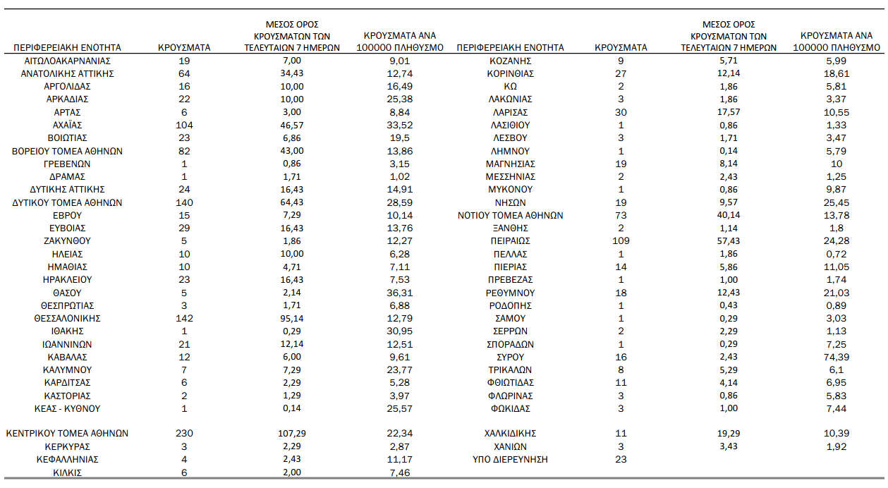 Τανέα εργαστηριακά επιβεβαιωμένα κρούσματα της νόσου που καταγράφηκαν τις τελευταίες 24 ώρες είναι1.460, εκ των οποίων 2 εντοπίστηκαν κατόπιν ελέγχων στις πύλες εισόδου της χώρας. Ο συνολικός αριθμός των κρουσμάτων ανέρχεται σε 177.494 (ημερήσια μεταβολή +0.8%), εκ των οποίων 51.8% άνδρες. Με βάση τα επιβεβαιωμένα κρούσματα των τελευταίων 7 ημερών, 49 θεωρούνται σχετιζόμενα με ταξίδι από το εξωτερικό και 1.615 είναι σχετιζόμενα με ήδη γνωστό κρούσμα.