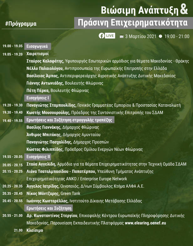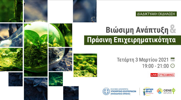 Ο Όμιλος Ενεργών Νέων Φλώρινας και το Κέντρο Ευρωπαϊκής Πληροφόρησης – Europe Direct Δυτικής Μακεδονίας, διοργανώνουν ανοιχτή διαδικτυακή εκδήλωση/φόρουμ για τη Βιώσιμη Ανάπτυξη και την Πράσινη Επιχειρηματικότητα στη Δυτική Μακεδονία, την Τετάρτη 3 Μαρτίου 2021 και ώρα 19.00.