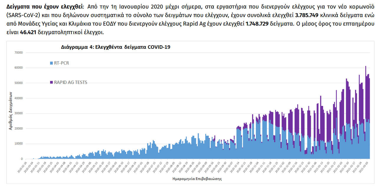 Τα νέα εργαστηριακά επιβεβαιωμένα κρούσματα της νόσου που καταγράφηκαν τις τελευταίες 24 ώρες είναι 2.301, εκ των οποίων 14 εντοπίστηκαν κατόπιν ελέγχων στις πύλες εισόδου της χώρας. Ο συνολικός αριθμός των κρουσμάτων ανέρχεται σε 203.978 (ημερήσια μεταβολή +1.1%), εκ των οποίων 51.7% άνδρες. Με βάση τα επιβεβαιωμένα κρούσματα των τελευταίων 7 ημερών, 72 θεωρούνται σχετιζόμενα με ταξίδι από το εξωτερικό και 3.231 είναι σχετιζόμενα με ήδη γνωστό κρούσμα.