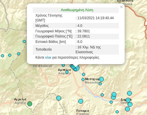 Μία ακόμη σεισμική δόνηση σημειώθηκε 16 χλμ Νοτιοδυτικά της Ελασσόνας το μεσημέρι της Πέμπτης 11 Μαρτίου 2021 στις 16:19, η οποία έγινε αισθητή στην Κοζάνη.