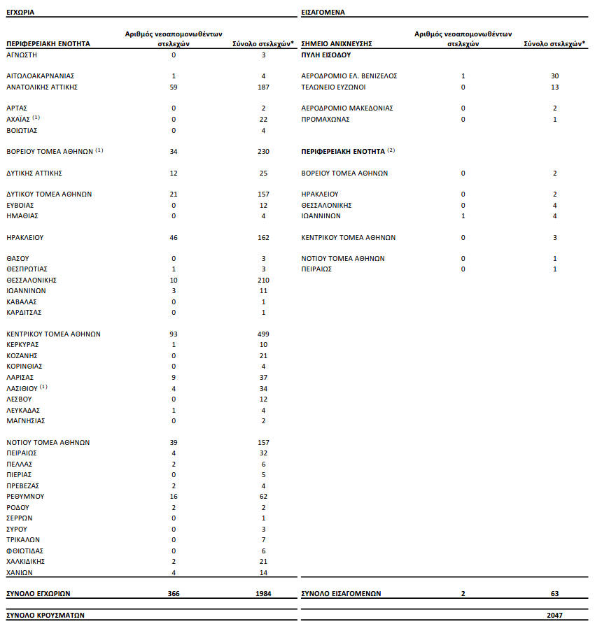 Συνολικά έχουν ταυτοποιηθεί 2.047 θετικά για την παρουσία μετάλλαξης Β.1.1.7/UK lineage (Variant VOC_202012) και 51 θετικά γιατην παρουσία μετάλλαξης B.1.351/South Africa (Variant 501.V2) από την έναρξη λειτουργίας του Εθνικού Δικτύου Γονιδιωματικής Επιτήρησης γιατις μεταλλάξεις του SARS- CoV-2 έως σήμερα.