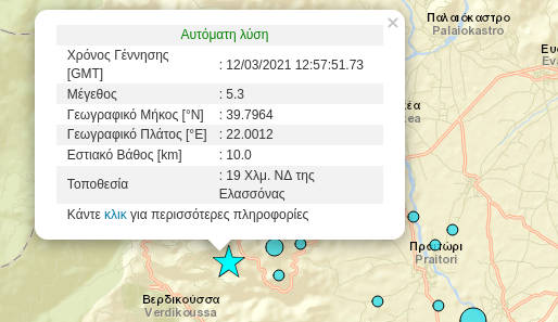 Νέα σεισμική δόνηση σημειώθηκε το μεσημέρι της Παρασκευής 12 Μαρτίου 2021 στις 14:57 στην περιοχή της Ελασσόνας.