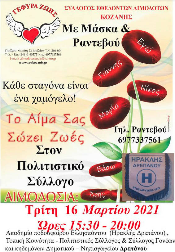 Την Τρίτη 16 Μαρτίου 2021 και ΩΡΑ 15:30-20:00 ( προσέλευση 19:30) στον Χώρο του Πολιτιστικού Συλλόγου του Δ.Δ. Δρεπάνου Αιμοδοσία σε συνεργασία με την Ακαδημία ποδοσφαίρου Ελλησπόντου (Ηρακλής Δρεπάνου), Τοπική Κοινότητα, Πολιτιστικό Σύλλογο & Σύλλογο Γονέων και Κηδεμόνων Δημοτικού – Νηπιαγωγείου Δρεπάνου & την Αιμοδοσία του Γ.Ν. Κοζάνης.