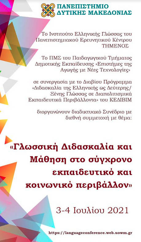 Το Ινστιτούτο Ελληνικής Γλώσσας του Πανεπιστημιακού Ερευνητικού Κέντρου ΤΗΜΕΝΟΣ, το Πρόγραμμα Μεταπτυχιακών Σπουδών του Παιδαγωγικού Τμήματος Δημοτικής Εκπαίδευσης «Επιστήμες της Αγωγής με Νέες Τεχνολογίες», σε συνεργασία με το Δια βίου Πρόγραμμα «Διδασκαλία της Ελληνικής ως Δεύτερης/Ξένης Γλώσσας σε Διαπολιτισμικά Εκπαιδευτικά Περιβάλλοντα» του Πανεπιστημίου Δυτικής Μακεδονίας, διοργανώνουν διαδικτυακό Συνέδριο με διεθνή συμμετοχή με θέμα: