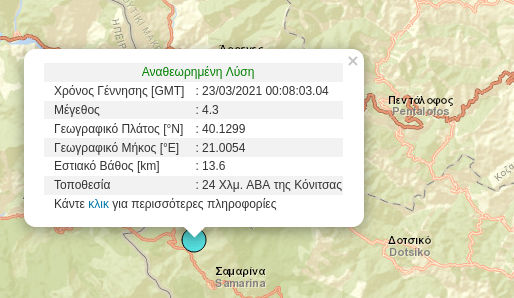 Σύμφωνα με τα νεότερα στοιχεία του Γεωδυναμικού Ινστιτούτου Αθηνών, η σεισμική δόνηση που σημειώθηκε τα ξημερώματα της Τρίτης 23 Μαρτίου ήταν μεγέθους 4,3 ρίχτερ, ενώ το επίκεντρο είναι δυτικότερα από αυτό που δόθηκε αρχική, στα 24 χλμ. βορειοανατολικά της Κόνιτσας, κοντά στη Σαμαρίνα Γρεβενών. Το εστιακό βάθος της σεισμικής δόνησης ήταν στα 13,6 χλμ.