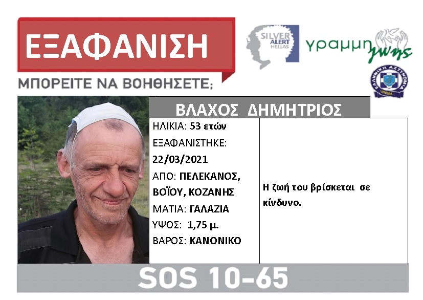 Ο Δημήτριος Βλάχος, 53 ετών, την 22/03/21 εξαφανίστηκε από το σπίτι του, στο χωριό Πελεκάνος, Bοϊου, Κοζάνης.