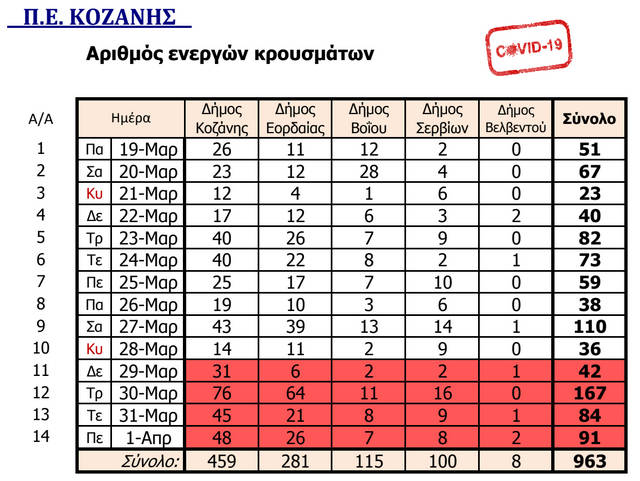 Δείτε από ποιους Δήμους της Π.Ε. Κοζάνης προέρχονται τα 91 χθεσινά κρούσματα κορονοϊού