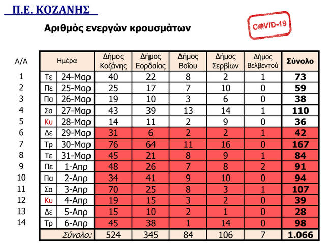 Η Περιφέρεια Δυτικής Μακεδονίας στα πλαίσια της ενημέρωσης για την εξέλιξη των κρουσμάτων κορωνοϊού, δίνει στη δημοσιότητα σχετικό πίνακα στον οποίο αποτυπώνεται ο αριθμός των ενεργών κρουσμάτων κατά Περιφερειακή Ενότητα.