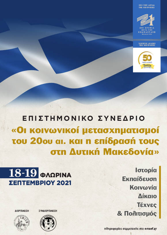 Η Εταιρεία Μελετών Ανθρωπιστικών Επιστημών Φλώρινας διοργανώνει, υπό την αιγίδα της επιτροπής ΕΛΛΑΔΑ 2021, επιστημονικό Συνέδριο με τίτλο: «Οι κοινωνικοί μετασχηματισμοί του 20ου αιώνα και η επίδρασή τους στη Δυτική Μακεδονία», στις 18-19 Σεπτέμβριου 2021, στη Φλώρινα.