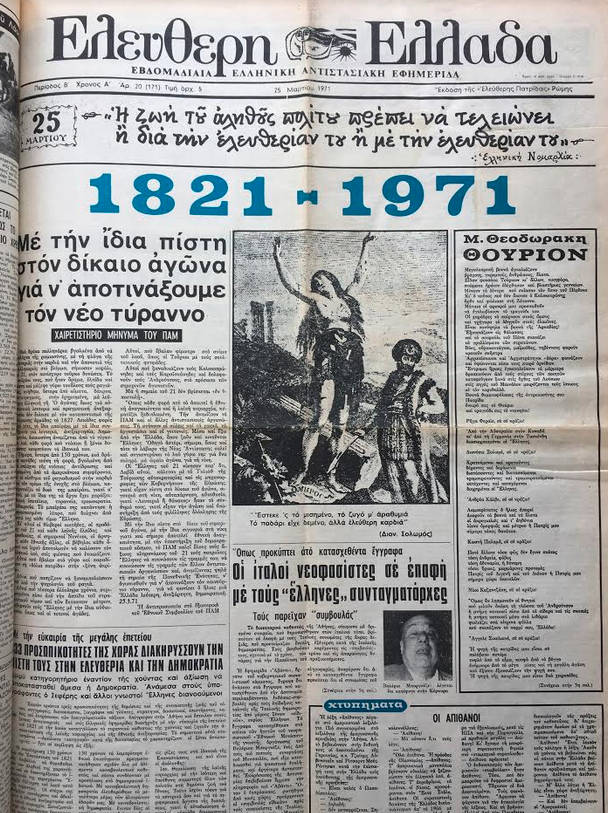 Στο τεύχος 201-202 της Παρέμβασης που κυκλοφορεί οσονούπω γίνεται εκτενής παρουσίαση της εβδομαδιαίας αντιδικτατορικής εφημερίδος «Ελεύθερη Ελλάδα» που εκδιδόταν στην Ιταλία από το Πατριωτικό Αντιδικτατορικό Μέτωπο (ΠΑΜ). Στο φ. 20/ 25 Μαρτίου 1971 η εφημερίδα τιμά την 150η επέτειο από την έναρξη της ελληνικής επαναστάσεως του 1821, με συνεργασίες επώνυμων ανθρώπων του πνεύματος και πολιτικούς.
