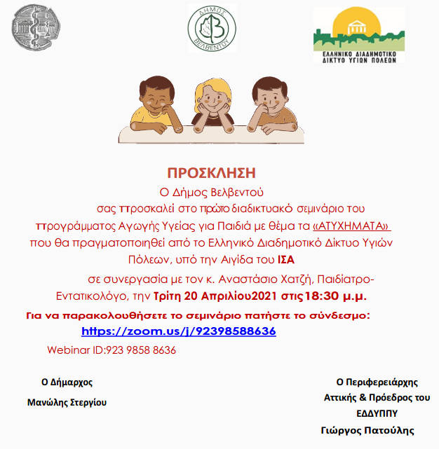 Το Ελληνικό Διαδημοτικό Δίκτυο Υγιών Πόλεων-Προαγωγής Υγείας (ΕΔΔΥΠΠΥ) σε συνεργασία με το Δήμο Βελβεντού υπό την Αιγίδα του ΙΣΑ, ανακοινώνει την έναρξη του διαδικτυακού προγράμματος «Αγωγή Υγείας για Παιδιά» την Τρίτη 20 Απριλίου 2021 και ώρα 18:30μ.μ .