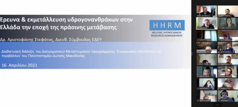 Στο πλαίσιο του Διατμηματικού Προγράμματος Μεταπτυχιακών Σπουδών ‘Ενεργειακές επενδύσεις και περιβάλλον’, του Τμήματος Χημικών Μηχανικών του Πανεπιστημίου Δυτικής Μακεδονίας, πραγματοποιήθηκε, την Παρασκευή 16 Απριλίου 2021, διαδικτυακή διάλεξη στους φοιτητές του προγράμματος από τον κ. Αριστοφάνη Στεφάτο, Διευθύνοντα Σύμβουλο της ΕΔΕΥ (Ελληνική Διαχειριστική Εταιρεία Υδρογονανθράκων), αναφορικά με την έρευνα και εκμετάλλευση υδρογονανθράκων στην Ελλάδα στην εποχή της πράσινης μετάβασης.