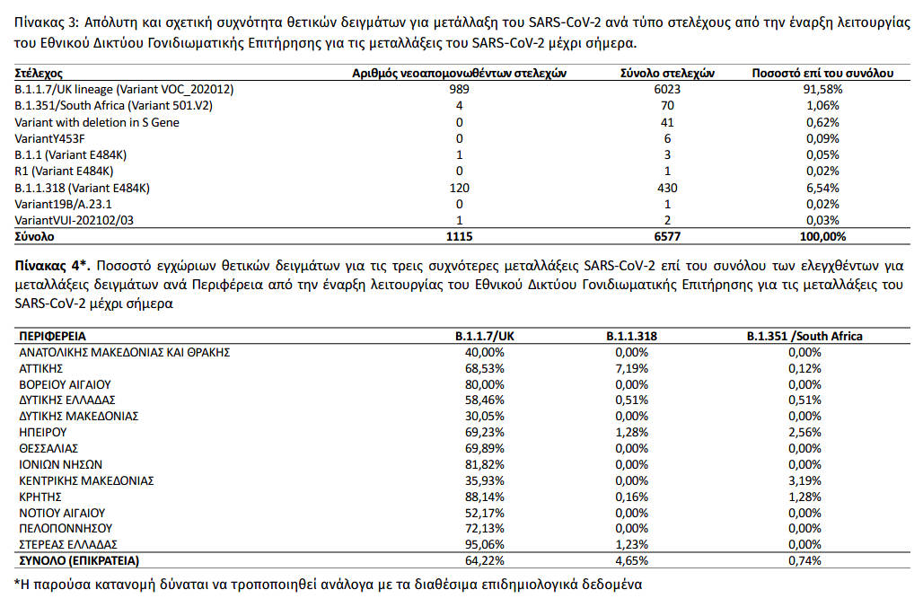 Εκ των 993 δειγμάτων με στελέχη μεταλλάξεων ειδικού ενδιαφέροντος, τα 989 αφορούσαν τη μετάλλαξη Β.1.1.7/UK lineage (Variant VOC_202012) και 4 αφορούσαν τη μετάλλαξη B.1.351/SouthAfrica (Variant 501.V2), ενώ από τα 122 δείγματα με στελέχη VUI, τα 120 αφορούσαν το στέλεχος B.1.1.318 (Variant_E484K), 1 αφορούσε τοστέλεχος Β.1.1 (Variant_Ε484Κ) και 1 αφορούσε το στέλεχος VariantVUI-202102/03 (Πίνακας 3).
