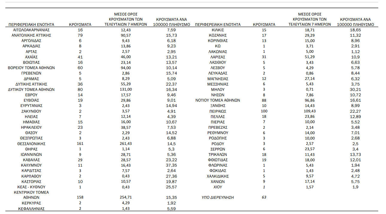 Τα νέα εργαστηριακά επιβεβαιωμένα κρούσματα της νόσου που καταγράφηκαν τις τελευταίες 24 ώρες είναι 1.317, εκ των οποίων 7 εντοπίστηκαν κατόπιν ελέγχων στις πύλες εισόδου της χώρας. Ο συνολικός αριθμός των κρουσμάτων ανέρχεται σε 334.436 (ημερήσια μεταβολή +0.4%), εκ των οποίων 51.3% άνδρες. Με βάση τα επιβεβαιωμένα κρούσματα των τελευταίων 7 ημερών, 69 θεωρούνται σχετιζόμενα με ταξίδι από το εξωτερικό και 2.662 είναι σχετιζόμενα με ήδη γνωστό κρούσμα.