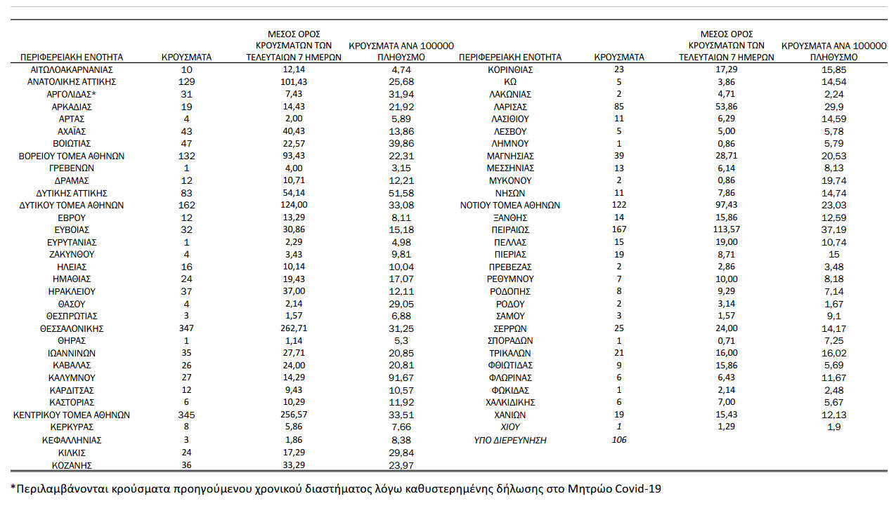 Τα νέα εργαστηριακά επιβεβαιωμένα κρούσματα της νόσου που καταγράφηκαν τις τελευταίες 24 ώρες είναι 2.435, εκ των οποίων 5 εντοπίστηκαν κατόπιν ελέγχων στις πύλες εισόδου της χώρας. Ο συνολικός αριθμός των κρουσμάτων ανέρχεται σε 342.908 (ημερήσια μεταβολή +0.7%), εκ των οποίων 51.3% άνδρες. Με βάση τα επιβεβαιωμένα κρούσματα των τελευταίων 7 ημερών, 49 θεωρούνται σχετιζόμενα με ταξίδι από το εξωτερικό και 2.478 είναι σχετιζόμενα με ήδη γνωστό κρούσμα.