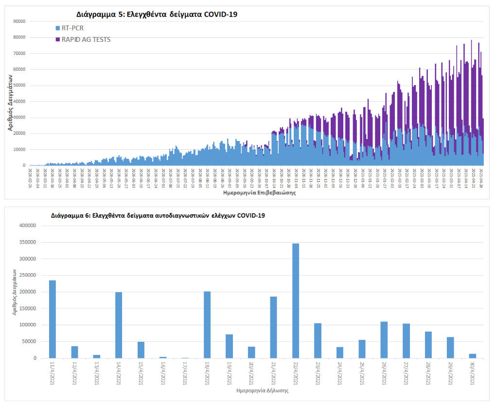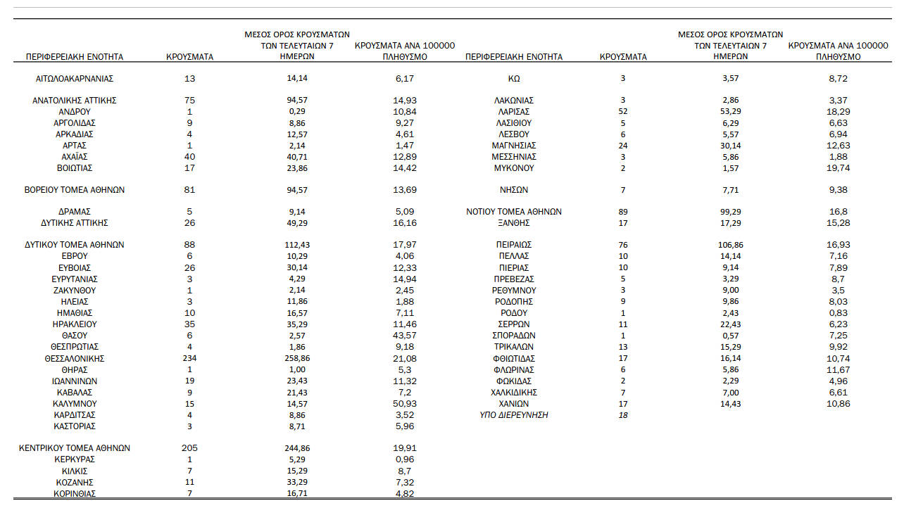 Τα νέα εργαστηριακά επιβεβαιωμένα κρούσματα της νόσου που καταγράφηκαν τις τελευταίες 24 ώρες είναι 1.391, εκ των οποίων 2 εντοπίστηκαν κατόπιν ελέγχων στις πύλες εισόδου της χώρας. Ο συνολικός αριθμός των κρουσμάτων ανέρχεται σε 346.422 (ημερήσια μεταβολή +0.4%), εκ των οποίων 51.3% άνδρες. Με βάση τα επιβεβαιωμένα κρούσματα των τελευταίων 7 ημερών, 41 θεωρούνται σχετιζόμενα με ταξίδι από το εξωτερικό και 1.999 είναι σχετιζόμενα με ήδη γνωστό κρούσμα.