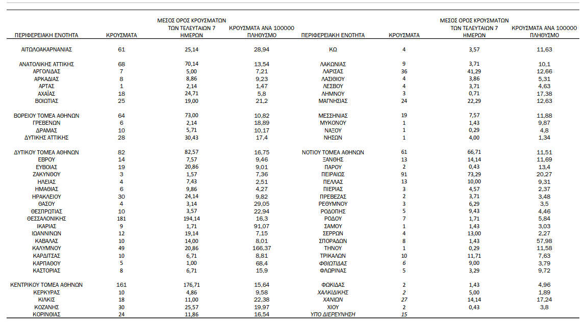 Τα νέα εργαστηριακά επιβεβαιωμένα κρούσματα της νόσου που καταγράφηκαν τις τελευταίες 24 ώρες είναι 1.387, εκ των οποίων 2 εντοπίστηκαν κατόπιν ελέγχων στις πύλες εισόδου της χώρας. Ο συνολικός αριθμός των κρουσμάτων ανέρχεται σε 349.936 (ημερήσια μεταβολή +0.4%), εκ των οποίων 51.3% άνδρες. Με βάση τα επιβεβαιωμένα κρούσματα των τελευταίων 7 ημερών, 34 θεωρούνται σχετιζόμενα με ταξίδι από το εξωτερικό και 957 είναι σχετιζόμενα με ήδη γνωστό κρούσμα.