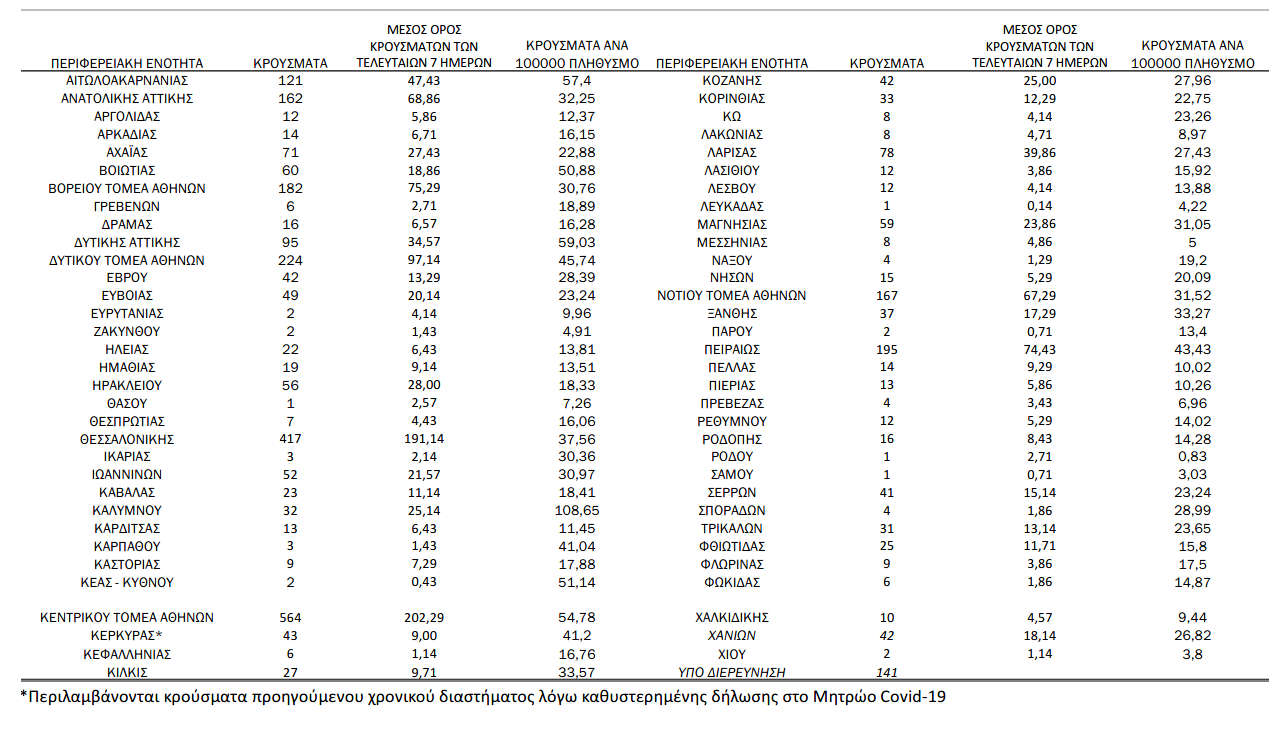Τα νέα εργαστηριακά επιβεβαιωμένα κρούσματα της νόσου που καταγράφηκαν τις τελευταίες 24 ώρες είναι 3.421, εκ των οποίων 9 εντοπίστηκαν κατόπιν ελέγχων στις πύλες εισόδου της χώρας. Ο συνολικός αριθμός των κρουσμάτων ανέρχεται σε 355.445 (ημερήσια μεταβολή +1.0%), εκ των οποίων 51.2% άνδρες. Με βάση τα επιβεβαιωμένα κρούσματα των τελευταίων 7 ημερών, 46 θεωρούνται σχετιζόμενα με ταξίδι από το εξωτερικό και 1.214 είναι σχετιζόμενα με ήδη γνωστό κρούσμα.