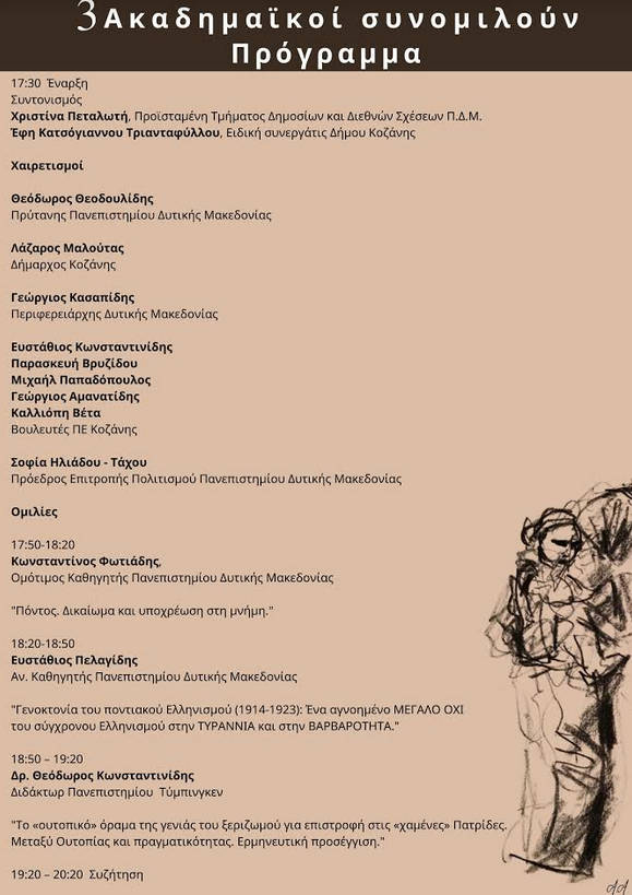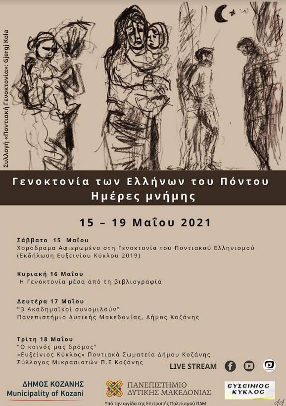 Ο Δήμος Κοζάνης, το Πανεπιστήμιο Δυτικής Μακεδονίας και τα Ποντιακά Σωματεία «Ευξείνιος Κύκλος» διοργανώνουν, ως ελάχιστο φόρο τιμής και μνήμης, μια σειρά διαδικτυακών εκδηλώσεων διάρκειας τεσσάρων ημερών, με τίτλο «Γενοκτονία των Ελλήνων του Πόντου | Ημέρες Μνήμης».