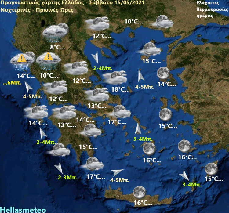 Μέσα στην νύχτα και κατά την διάρκεια των πρωινών ωρών, ο καιρός σε γενικές γραμμές θα είναι αρκετά καλός στις περισσότερες περιοχές της χώρας μας και ιδιαίτερα στα πιο ανατολικά ηπειρωτικά τμήματα και τα νησιά του Αιγαίου όπου θα επικρατήσει ξαστεριά. Κάπως περισσότερες αναμένεται να είναι οι νεφώσεις στην δυτική Ελλάδα, οι οποίες μέχρι το ξημέρωμα θα επεκταθούν στα περισσότερα δυτικά, κεντρικά και βόρεια τμήματα. Αργά το ξημέρωμα ο καιρός αναμένεται να παρουσιάσει σημαντική επιδείνωση στα βορειοδυτικά και θα ξεκινήσουν να εκδηλώνονται βροχές οι οποίες αρχικά θα επηρεάσουν το βόρειο Ιόνιο και μέχρι το πρωί την Ήπειρο. Μέσα στις πρωινές ώρες τα φαινόμενα θα ενταθούν σημαντικά και θα εκδηλωθούν καταιγίδες κατά τόπους ισχυρές. Υπαρκτό είναι το ενδεχόμενο τα φαινόμενα να παρουσιάσουν τοπικά σημάδια υψηλής ραγδαιότητας.