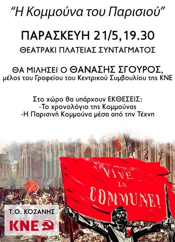 - Στην Κοζάνη, την Παρασκευή 21 Μαΐου, 7:30μμ, στο Θεατράκι της Πλατείας Συντάγματος, εκδήλωση με τίτλο «Η κομμούνα του Παρισιού» . Θα μιλήσει ο Θανάσης Σγούρος, μέλος του Γραφείου του ΚΣ της ΚΝΕ. Θα παρουσιαστούν εκθέσεις με το χρονολόγιο των γεγονότων της Κομμούνας και με καλλιτεχνικά έργα αφιερωμένα στην Παρισινή Κομμούνα από τις Οργανώσεις της ΚΝΕ.