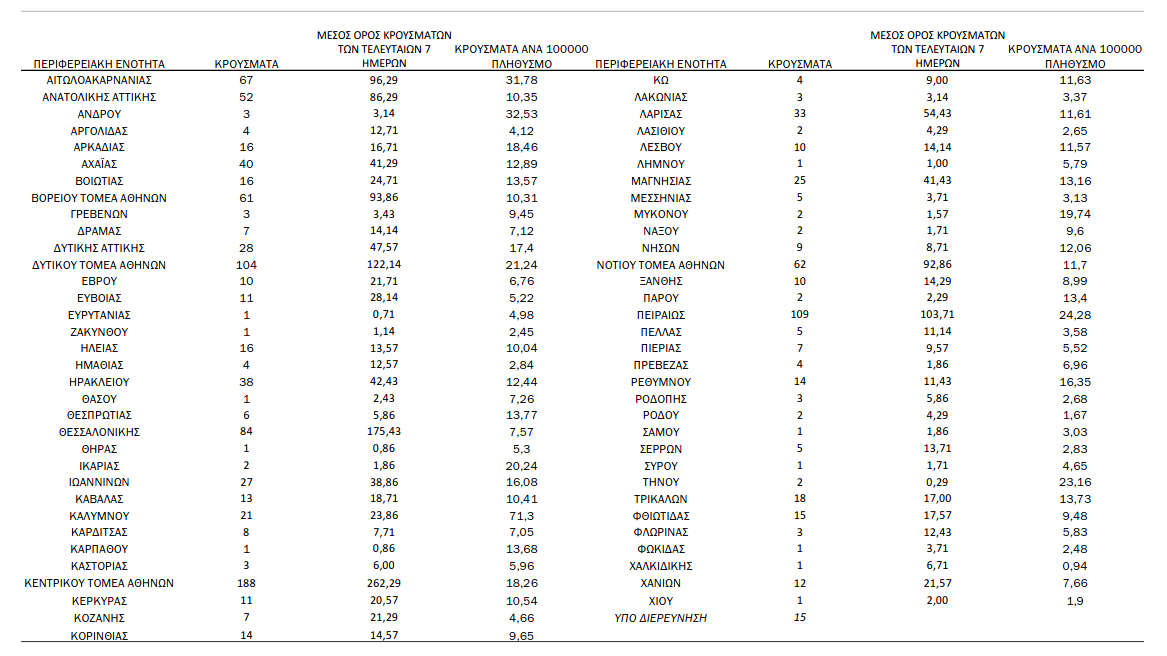 Τα νέα εργαστηριακά επιβεβαιωμένα κρούσματα της νόσου που καταγράφηκαν τις τελευταίες 24 ώρες είναι 1.262, εκ των οποίων 4 εντοπίστηκαν κατόπιν ελέγχων στις πύλες εισόδου της χώρας. Ο συνολικός αριθμός των κρουσμάτων ανέρχεται σε 377.090 (ημερήσια μεταβολή +0.3%), εκ των οποίων 51.2% άνδρες. 1 Με βάση τα επιβεβαιωμένα κρούσματα των τελευταίων 7 ημερών, 40 θεωρούνται σχετιζόμενα με ταξίδι από το εξωτερικό και 2.711 είναι σχετιζόμενα με ήδη γνωστό κρούσμα.