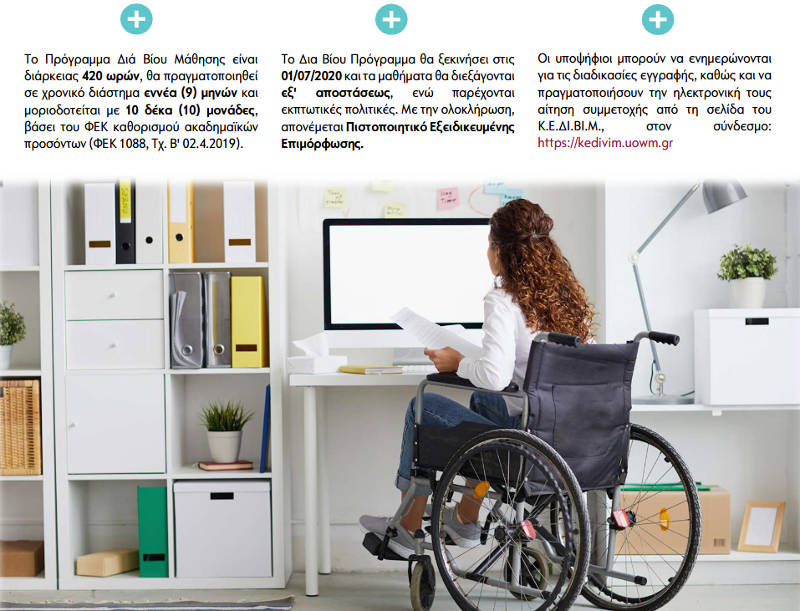 Το πρόγραμμα δια βίου μάθησης στην Ειδική Αγωγή με τον τίτλο: «Επικοινωνιακή Διαχείριση και Ένταξη Ατόμων με Αναπηρία στο Εργασιακό Περιβάλλον» αποσκοπεί στην απόκτηση βασικών γνώσεων σχετικά με την παρεχόμενη εκπαίδευση σε άτομα με αναπηρία, αναδεικνύοντας το βασικό ρόλο του σχολείου για την ενδυνάμωση της κοινωνικής συμμετοχής τους και κοινωνικοποίησή τους μέσα από προγράμματα συνεκπαίδευσης, ώστε να αναπτύξουν τις ανάλογες επικοινωνιακές δεξιότητες και δράσεις για τη μελλοντική τους επαγγελματική αποκατάσταση και ένταξη στο χώρο της εργασίας.