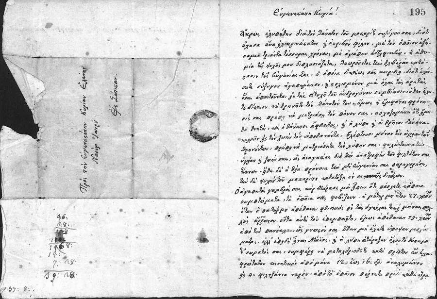 Ὁ ἀγαπητὸς γαμβρὸς σας κὺρ Μάρκος μοὶ εἶπεν ὅτι πάσχετε κἄποια συμπτώματα, τὰ ὁποῖα σᾶς φοβίζουν. Ἡ μήτηρ μου ἦτον 27: χρόνων ὅταν ὁ πατὴρ μου ἀπέθανε φθισικὸς εἰς τὰς ἀγκάλας της καὶ μήναις πολλοὺς ἄρρωστον ὄντα αὐτὴ τὸν ἐπεριποιεῖτο, ὅμως ἀπέθανεν 75: χρόνων ἀπὸ τὴν πανούκλαν, ὥς γνωστὸν σας. Ὅθεν μὴ ἔχετε ὑποψίαν μολύσματος. Ἀλλ’ ἐπειδὴ εἶναι Μάϊος, καὶ ἡ λύπη ἐτάραξεν ὅλον τὸ σύστημα τοῦ σώματὸς σας, συμφέρει νὰ μεταχειρισθῆτε κατὰ πρῶτον ἕν ἐλαφρώτατον κινητικὸν ἀπὸ μάνα 12:εως 16:δρ:ἀναλυμένον εἰς 4:φιλτζάνια νερόν, ἀπό τὸ ὁποῖον παίρνετε πρωΐ κάθε ὥρα ἕν φιλτζάνι. Ταῖς δὲ φιλτάτας σας θυγατράσι δίδετε 8 ἕως 12 δράμια. Δὲν ἠξεύρω τὴν κράσιν σας, ὅθεν δὲν ἠμπορῶ νὰ σᾶς προσδιορίσω ἀκριβῶς τὴν ποσότητα τοῦ μάνα. 12:δρ:ἐνδέχεται νὰ μὴ σᾶς κινήσουν. Ἄν τοῦτο, πάρετε τὴν αὔριον ἄλλα 8:δρ. Ἀρκεῖ νὰ εὔγητε 3-4 φοραὶς.