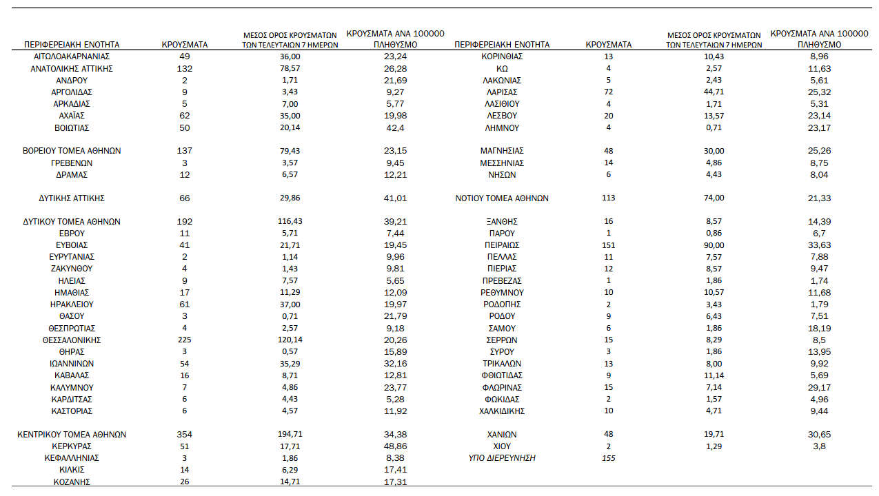 Ο συνολικός αριθμός των κρουσμάτων ανέρχεται σε 393.583 (ημερήσια μεταβολή +0.6%), εκ των οποίων 51.2% άνδρες. Με βάση τα επιβεβαιωμένα κρούσματα των τελευταίων 7 ημερών, 30 θεωρούνται σχετιζόμενα με ταξίδι από το εξωτερικό και 1.997 είναι σχετιζόμενα με ήδη γνωστό κρούσμα.