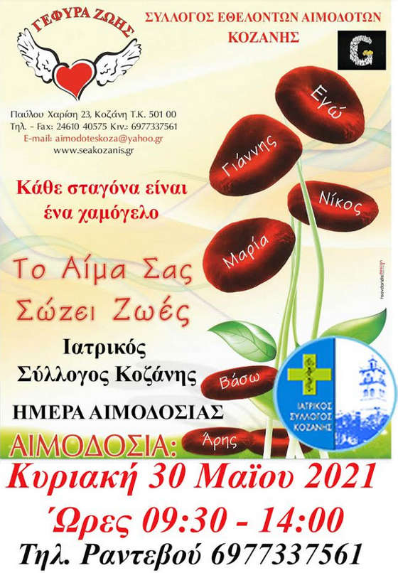 Την Κυριακή 30 Μαΐου Αιμοδοτούμε με τη συμμετοχή & του Ιατρικού Συλλόγου Κοζάνης (ΙΣΚ) από τις 09:30 – 14:30 στα γραφεία του Συλλόγου Αιμοδοτών, Π. Χαρίση 23.
