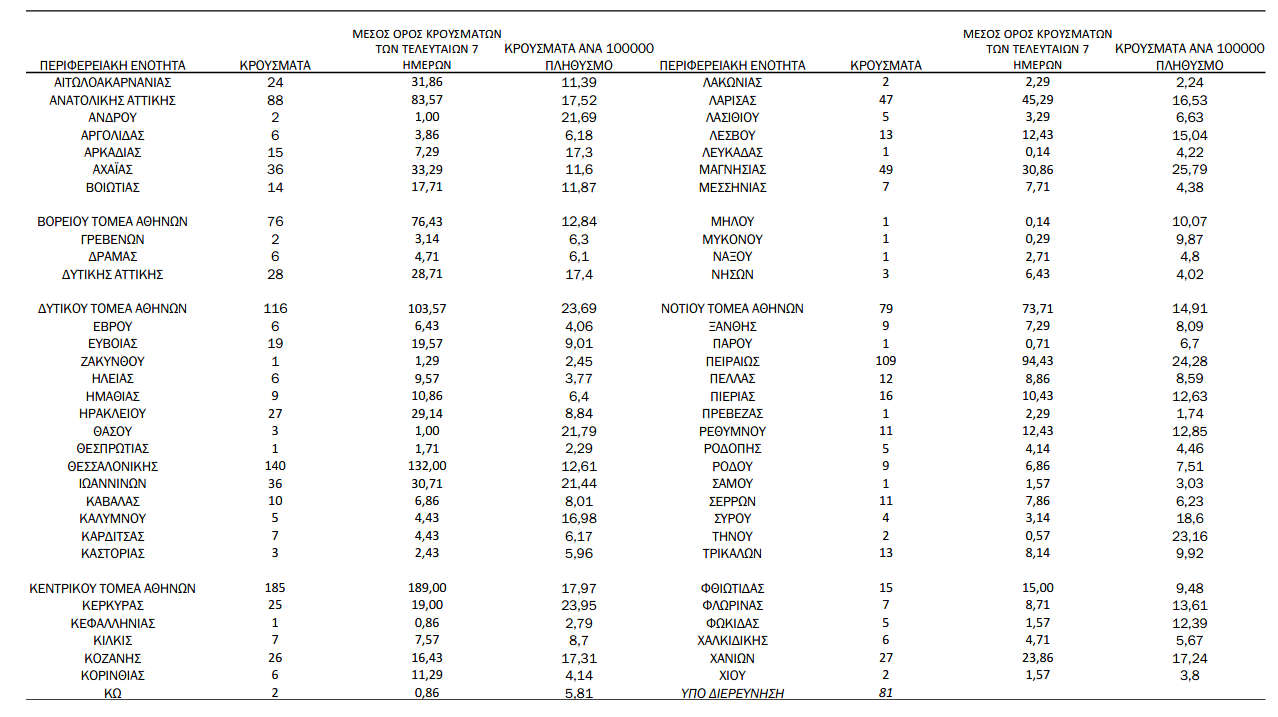 Ο ημερήσιος αριθμός και κρούσματα ανά 100.000 πληθυσμού επιβεβαιωμένων εγχώριων κρουσμάτων COVID-19 ανά περιφερειακή ενότητα στις 29 Μαΐου 2021: