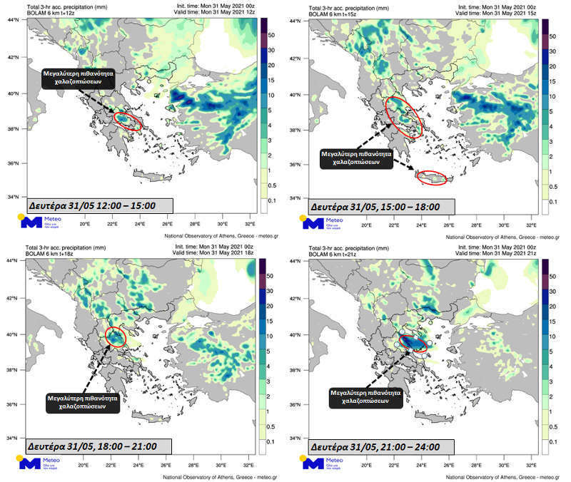 Ιδιαίτερα για το υπόλοιπο της Δευτέρας 31/05, τοπικές βροχές και καταιγίδες θα εκδηλωθούν σε Θράκη, Μακεδονία, Θεσσαλία, Ανατολική Στερεά, Βορειοανατολική Πελοπόννησο, Βόρειο και Ανατολικό Αιγαίο και Κρήτη, ενώ υπάρχει πιθανότητα εκδήλωσης χαλαζοπτώσεων κυρίως στη Θεσσαλία, στις Σποράδες, στην Ανατολική Στερεά (συμπεριλαμβανομένων των βορείων τμημάτων της Αττικής) και στην Κρήτη. Στους χάρτες που ακολουθούν παρουσιάζεται η βροχή που αναμένεται ανά τρίωρο έως το βράδυ της Δευτέρας 31/05 ενώ σημειώνονται και οι περιοχές όπου υπάρχει πιθανότητα εκδήλωσης χαλαζοπτώσεων.