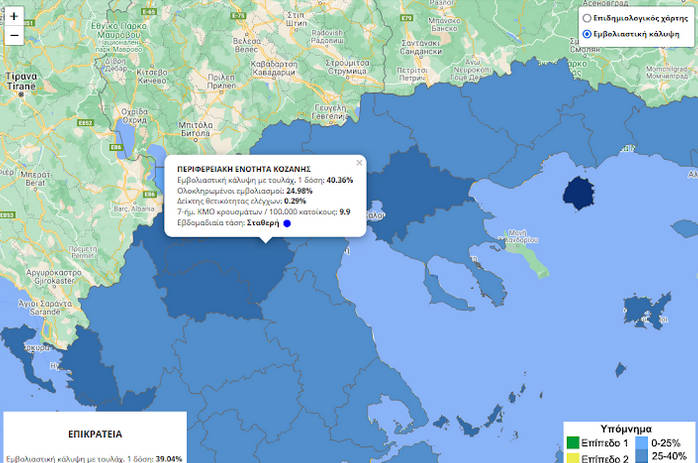 Στον παρακάτω χάρτη η ΠΕ Κοζάνης απεικονίζεται με ποσοστό εμβολιασμού του πληθυσμού που δεν ξεπερνά το 41%. Ως εκ τούτου, η εμποροπανήγυρη Δρεπάνου που ήταν προγραμματισμένη για τις 19-21 Ιουνίου, δεν θα πραγματοποιηθεί.