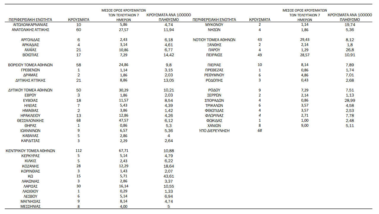 Ο συνολικός αριθμός των κρουσμάτων ανέρχεται σε 416.195 (ημερήσια μεταβολή +0.2%), εκ των οποίων 51.2% άνδρες. Με βάση τα επιβεβαιωμένα κρούσματα των τελευταίων 7 ημερών, 28 θεωρούνται σχετιζόμενα με ταξίδι από το εξωτερικό και 1.102 είναι σχετιζόμενα με ήδη γνωστό κρούσμα.